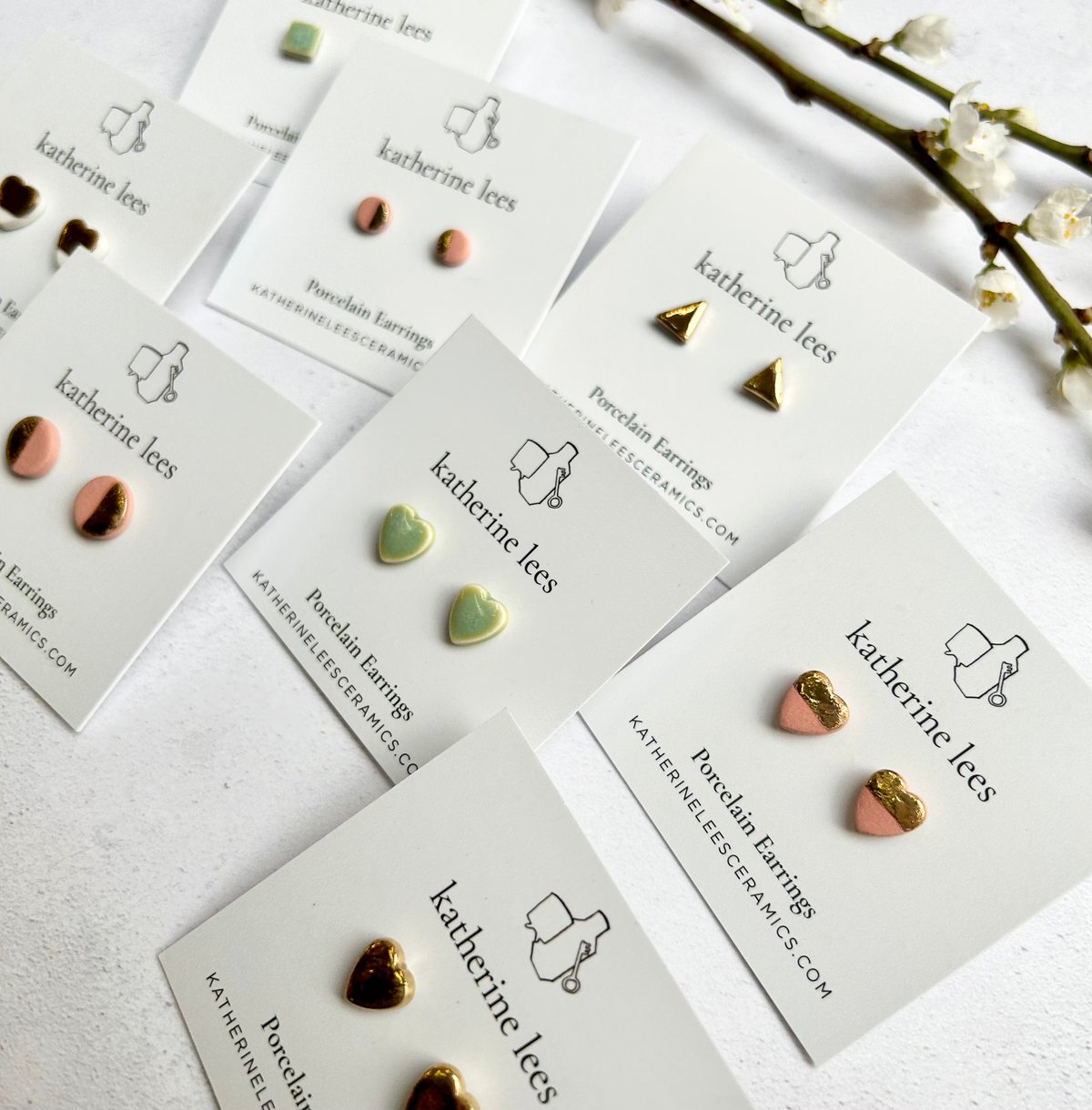 Beautiful small coloured porcelain stud earrings, hand painted with beautiful glaze and/or 12ct gold lustre. Sterling silver earring backs on the reverse make them perfect for all pierced ears.